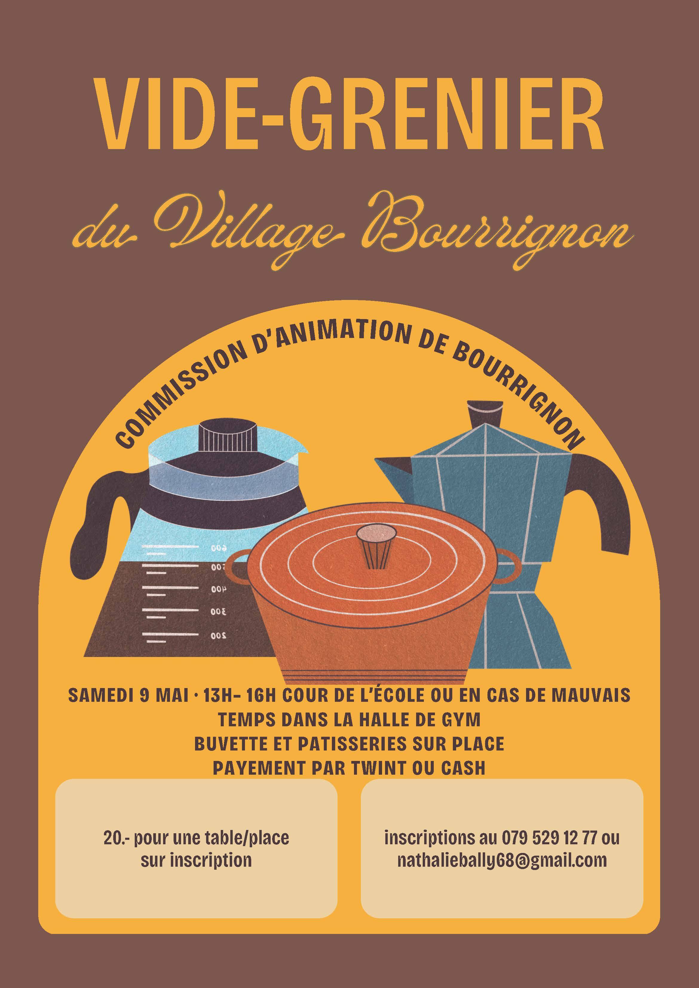 La Commission d'animation organise un vide grenier le samedi 9 mai 2026, de 13h00 à 16h00 sur la place de l'école de Bourrignon (ou à la halle de gymnastique en cas de mauvais temps).
